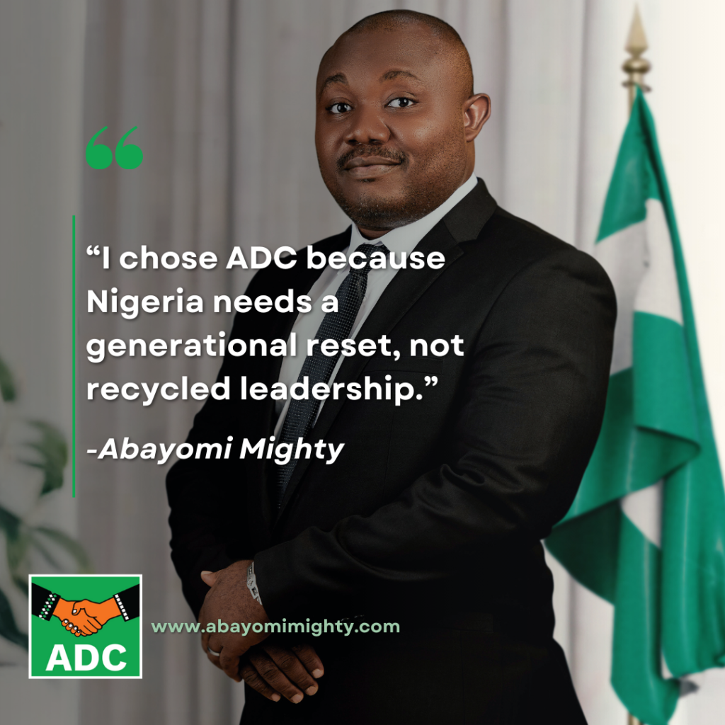 Abayomi Rotimi Mighty has officially joined the African Democratic Congress (ADC) and declared his intention to contest the 2027 Nigerian presidential election. His entry into the race signals a decisive moment in Nigeria’s political journey, one defined by a call for renewal, principled leadership, and a return to people-centred governance.
